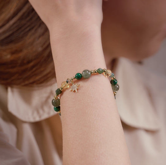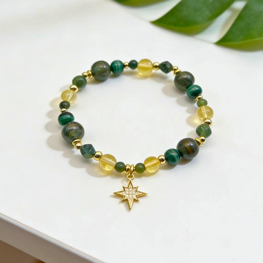 【森精靈】綠髮晶(偏深色祖母綠)。黃水晶。孔雀石。黃瑪瑙。綠瑪瑙