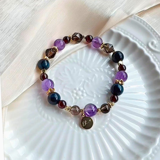 【夜絲絨】墨藍虎眼、紫水晶、茶晶、紅石榴石