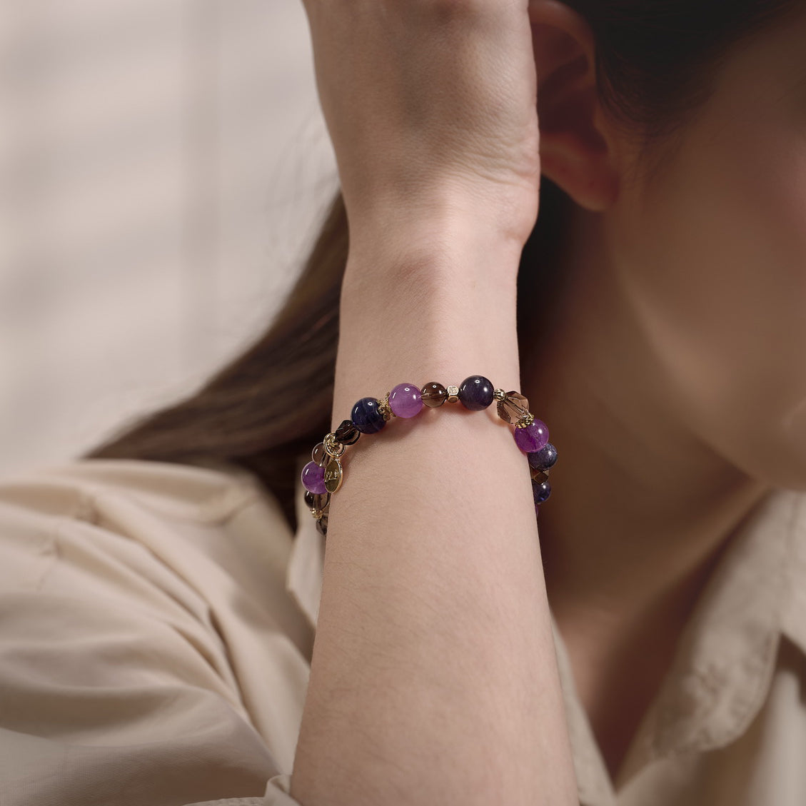 「夜絲絨」墨藍虎眼、紫水晶、茶晶、紅石榴石,展現奢華而深邃的深色美感。墨藍虎眼石增強勇氣與自信,追求事業成功的助力。紫水晶助於增加理性思維及增強觀察能力,又被稱為「社交之石」,能提升人緣及改善人際關係,在困境中沉著思考。紅石榴石增強愛情與熱情,增添熱情與魅力。茶晶則穩定情緒,提升耐力與抗壓力,助力事業穩健發展,