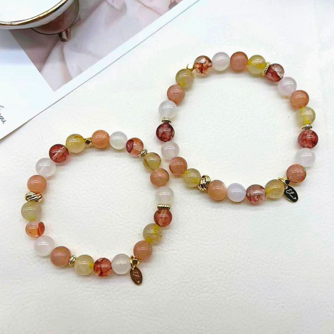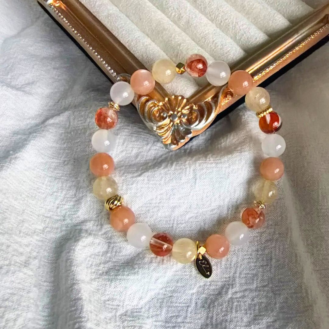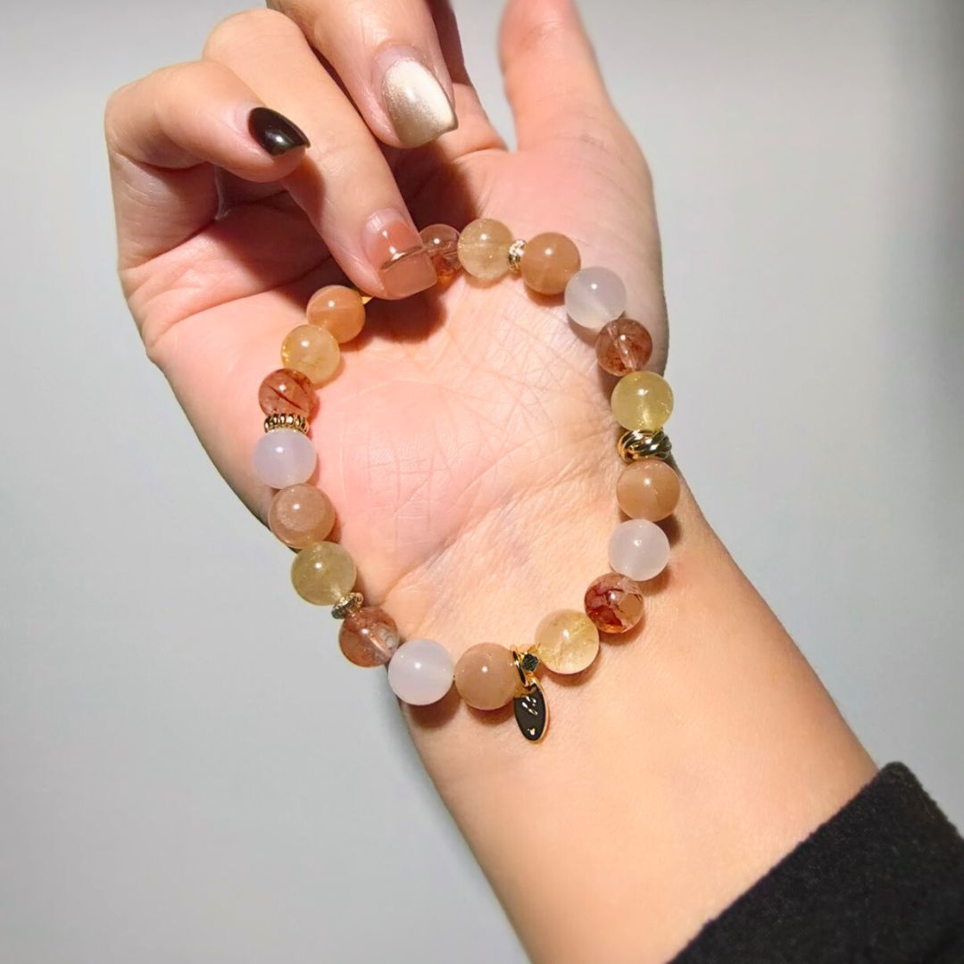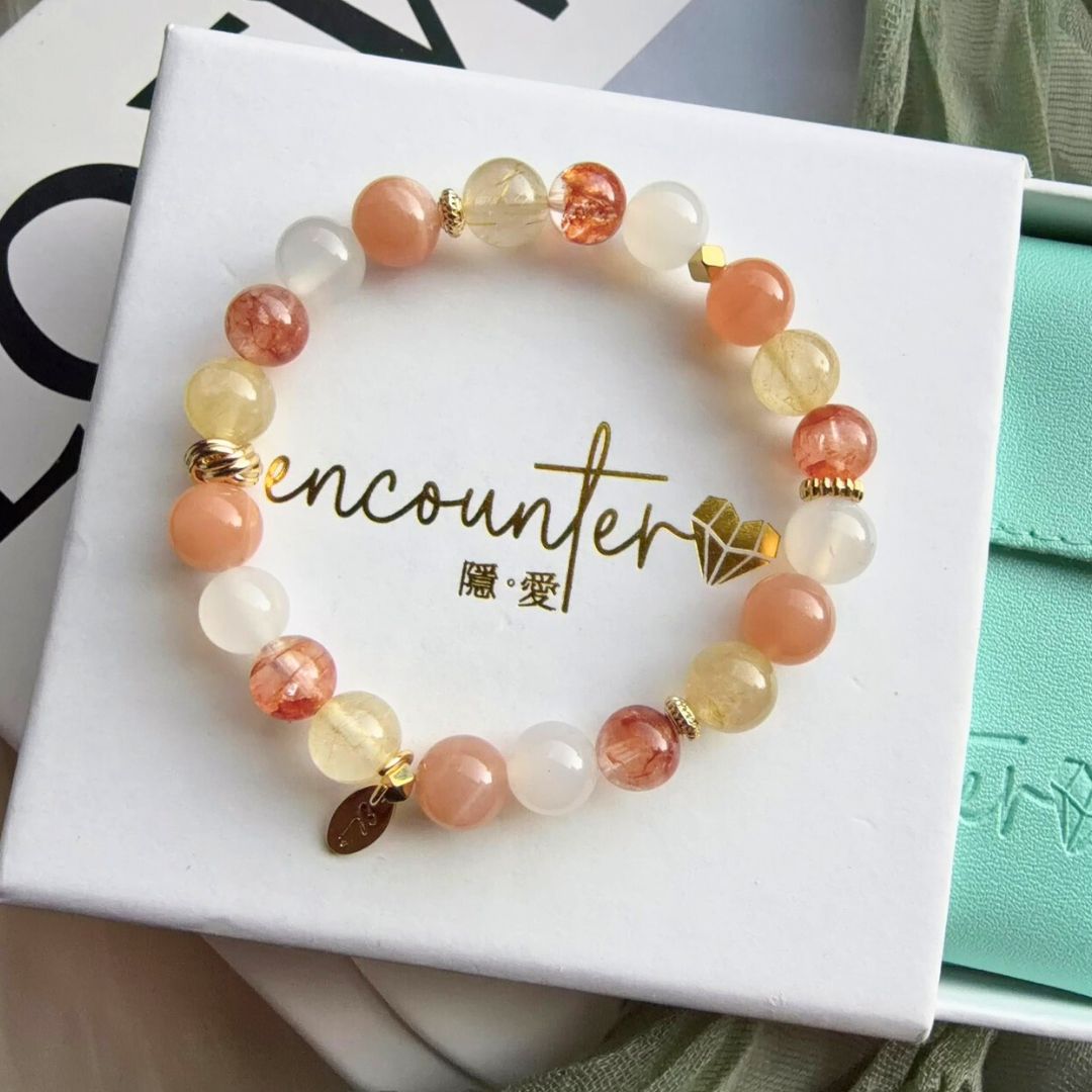 『旭日手鍊融合紅膠花、白瑪瑙、金髮、太陽石,亮麗朝氣充滿力量的設計,帶來如橙色夕陽般的溫暖氣息。太陽石提升活力與自信,陽光照特之下反射出金光閃閃的亮點,擁有正面強大的能量,同時具有強大的保護作用,紅膠花助於招財運與貴人運,金髮晶閃耀著細緻的金色光芒,能強化行動力與企圖心,幫助吸引財富與事業上的突破;白瑪瑙則以其溫潤純淨的能量,平衡情緒、淨化負能量,帶來內在的平靜與和諧。
