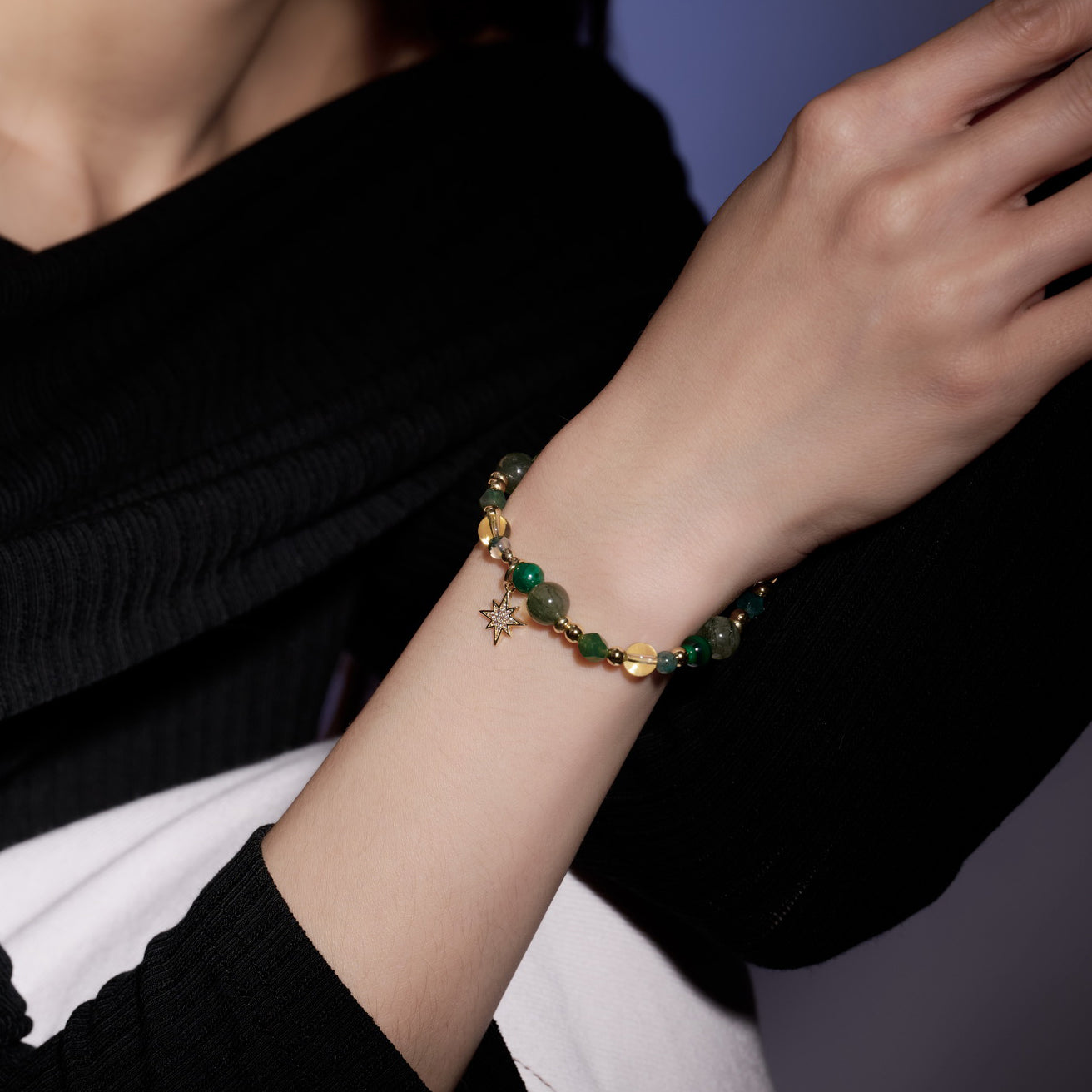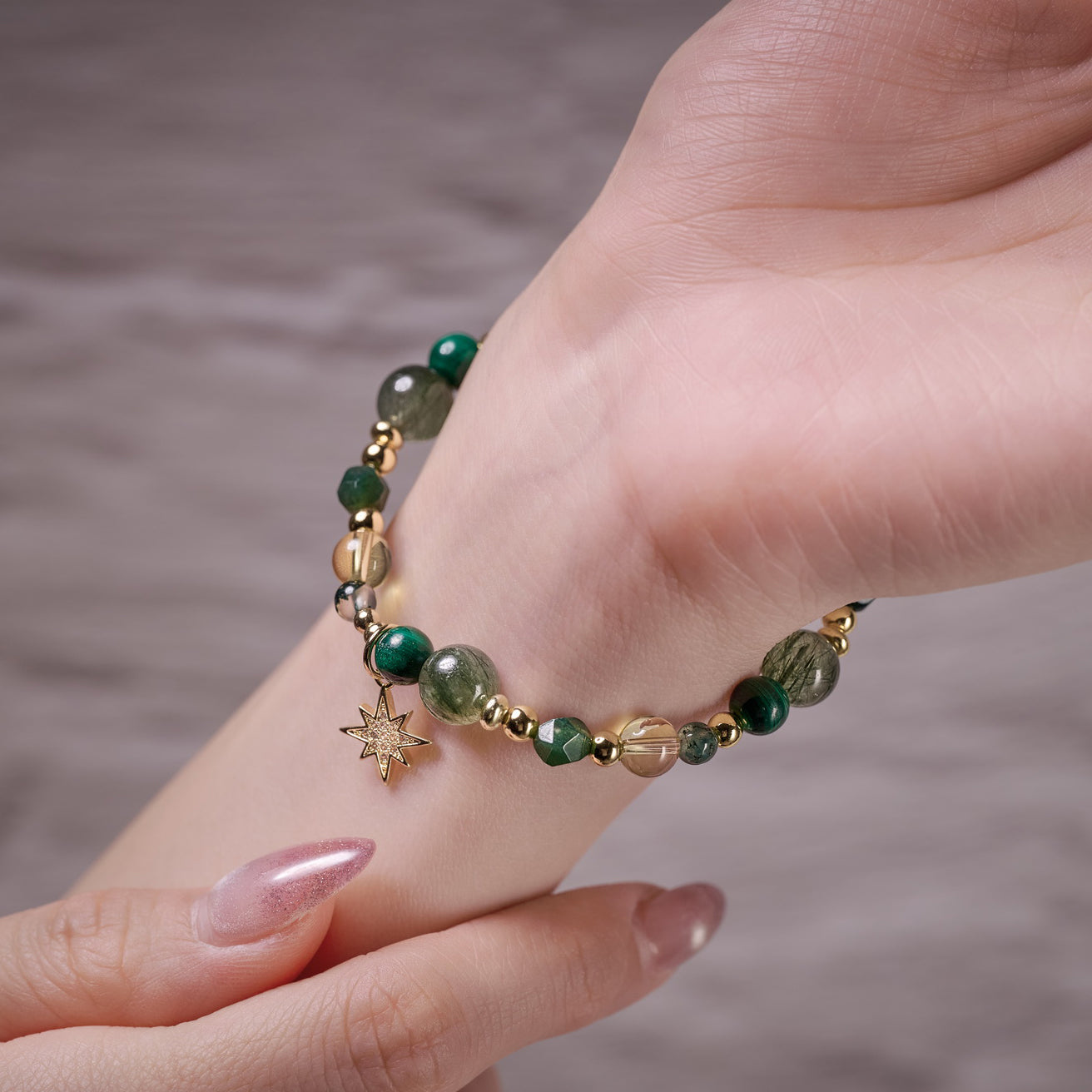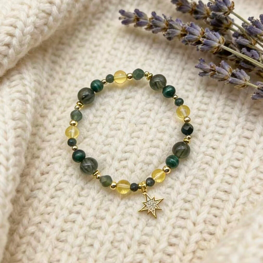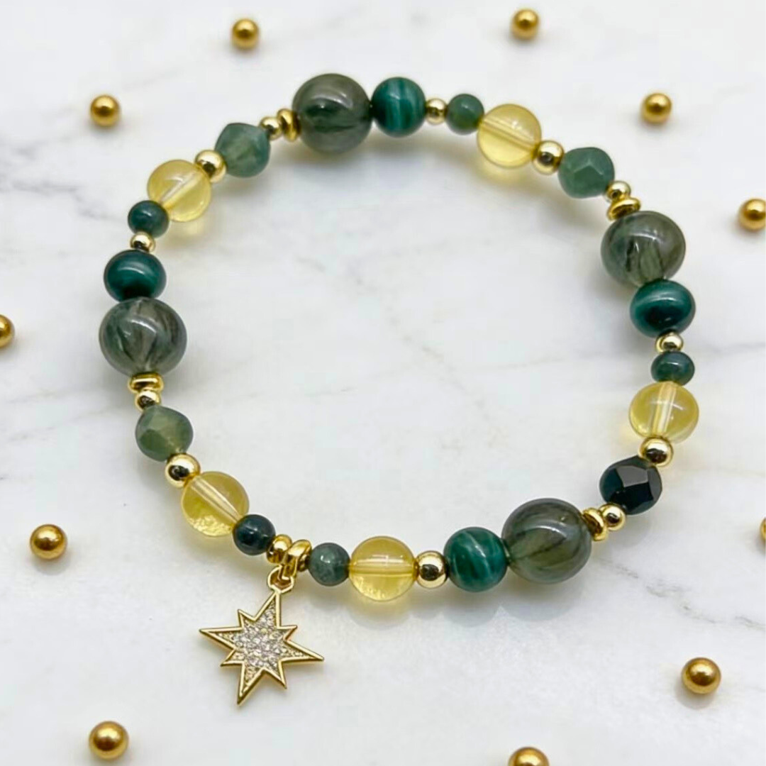 ❖ 水晶:綠髮晶(8mm偏深色祖母綠)、黃水晶(6mm)、孔雀石(6mm)、黃瑪瑙(4mm)、綠瑪瑙(4mm)