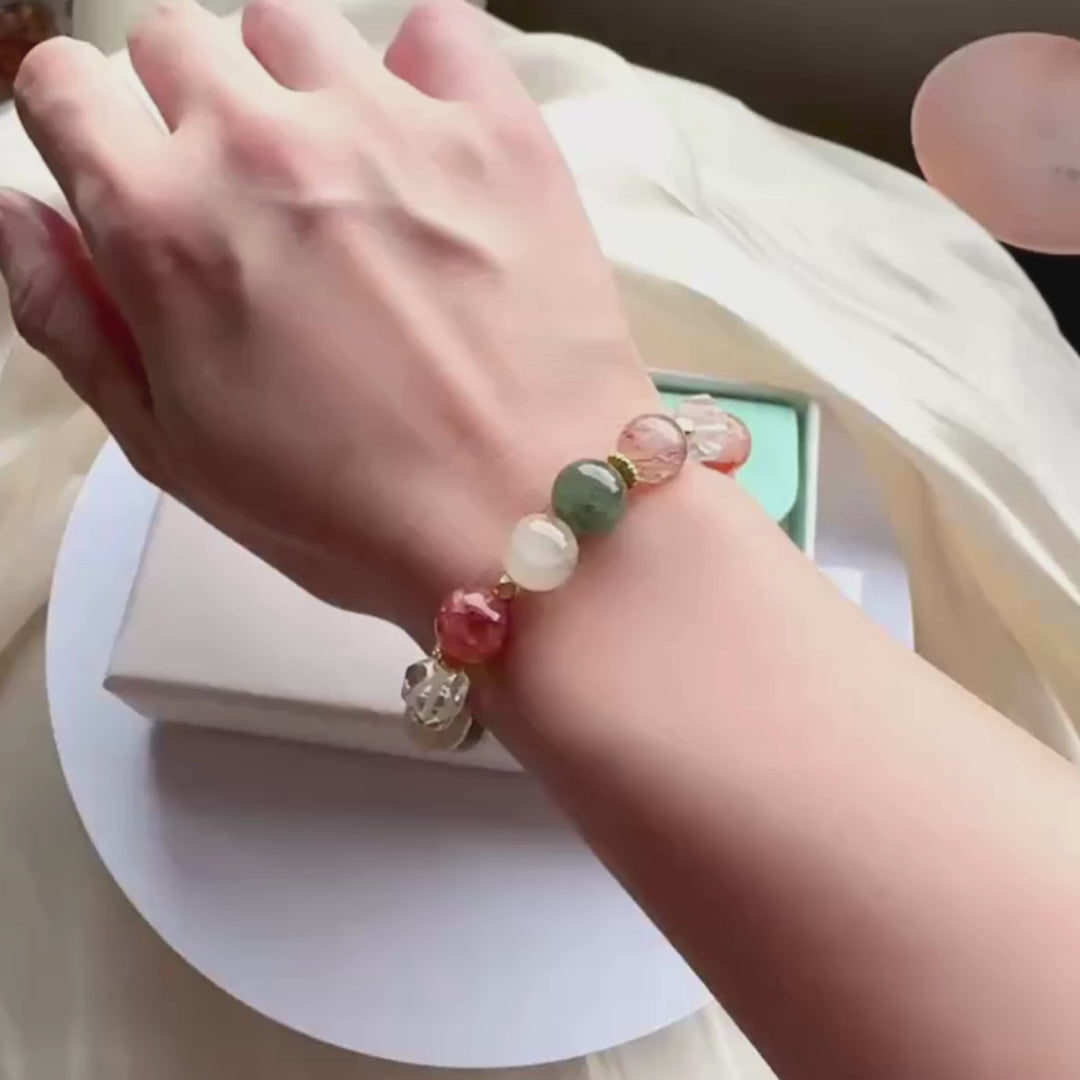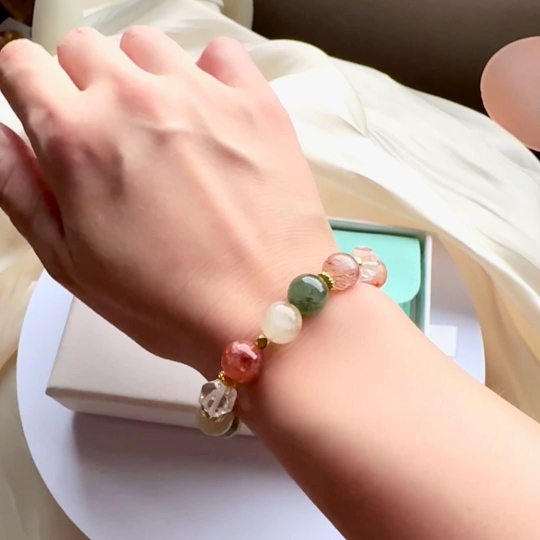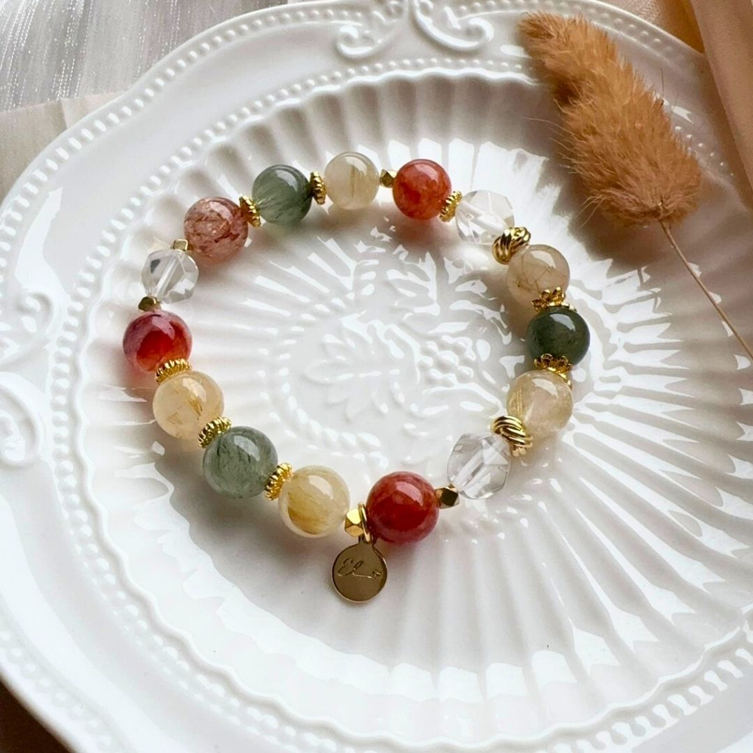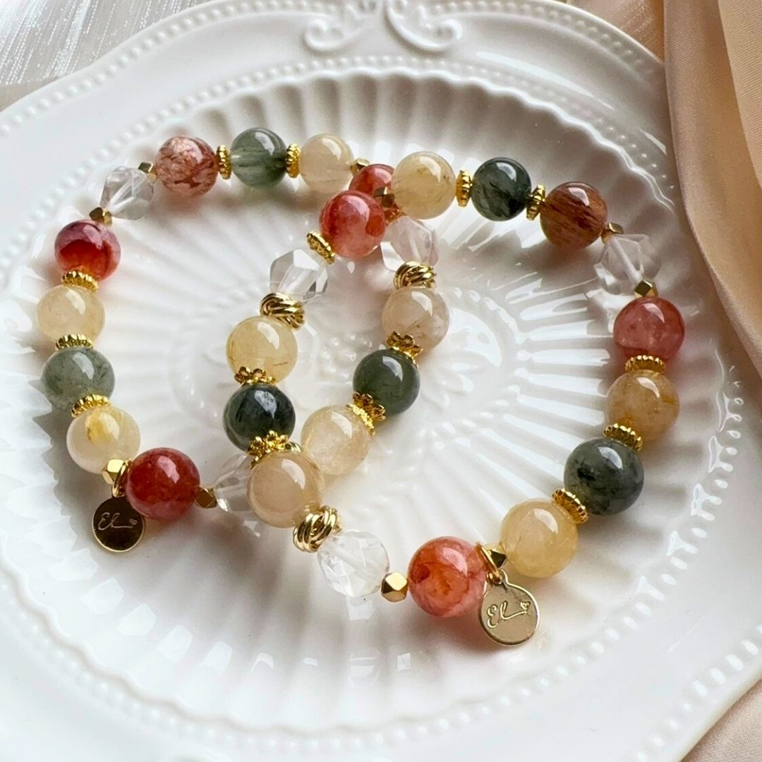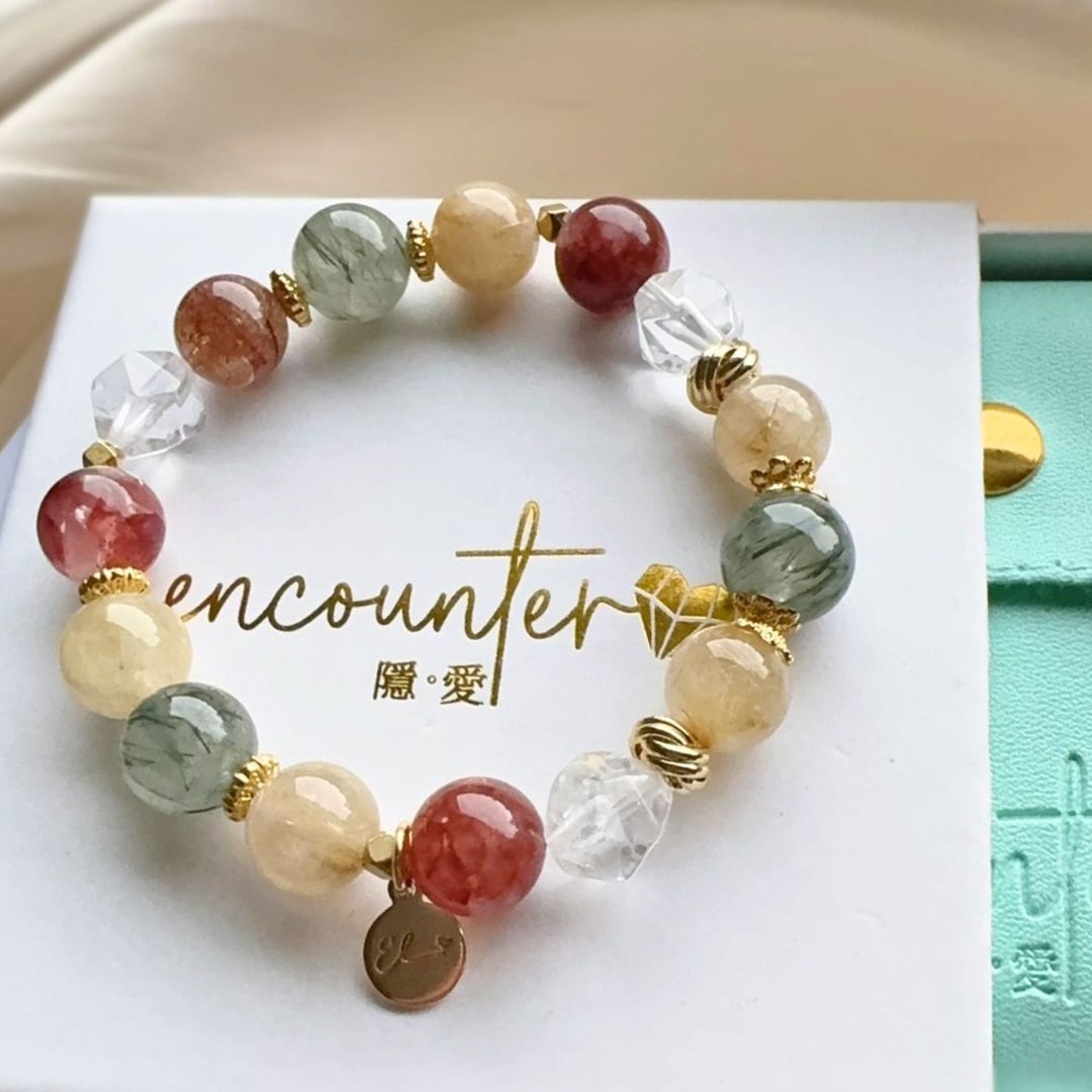 🆕【歲月舞曲】綠髮晶。金髮晶。紅膠花(深色款)。切面白水晶
