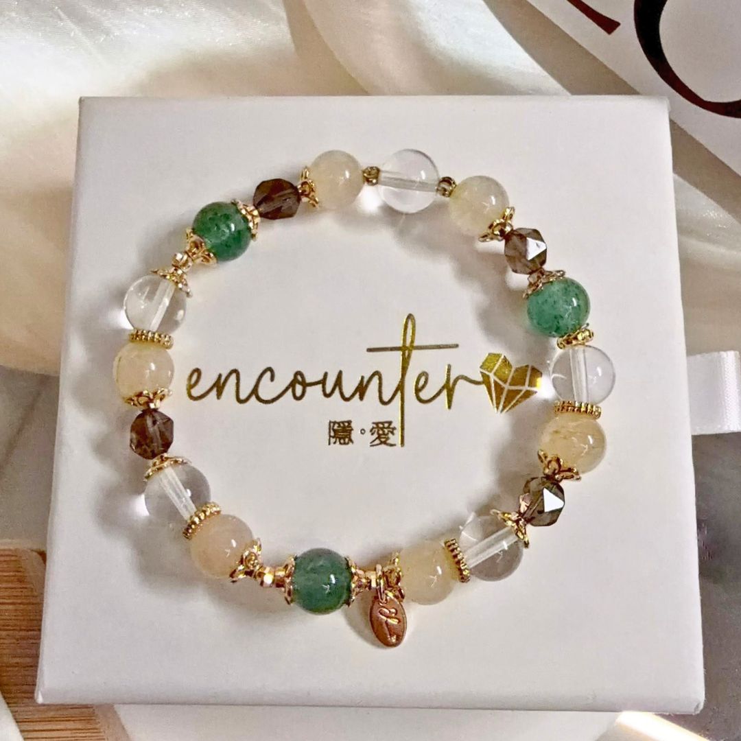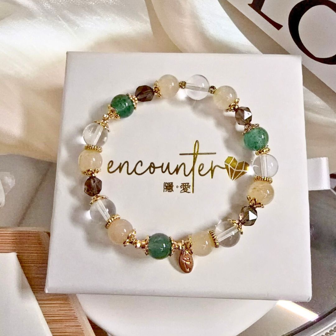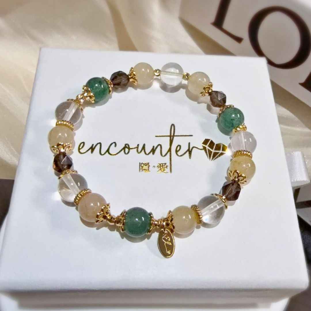 「綠野仙蹤」手鍊結合金髮晶、白水晶、綠草莓晶、茶晶,展現出優雅與富貴的氣質。金髮晶閃耀著細緻的金色光芒,能強化行動力與企圖心,幫助吸引財富與事業上的突破。白水晶瑙則以其溫潤純淨的能量,平衡情緒、淨化負能量,茶晶提升耐力與抗壓力,助力事業穩健發展。綠草莓晶有助於招桃花、帶來美好姻緣、改善人際互動,並能使人更加積極樂觀、提升學習與事業運勢。 綠草莓晶也被稱為「療癒之石」和「歡樂之石」。這款手鍊特別適合希望增強自信、提升職場表現佩戴,無論是日常穿搭還是重要場合,都能增添一抹優雅氛圍。