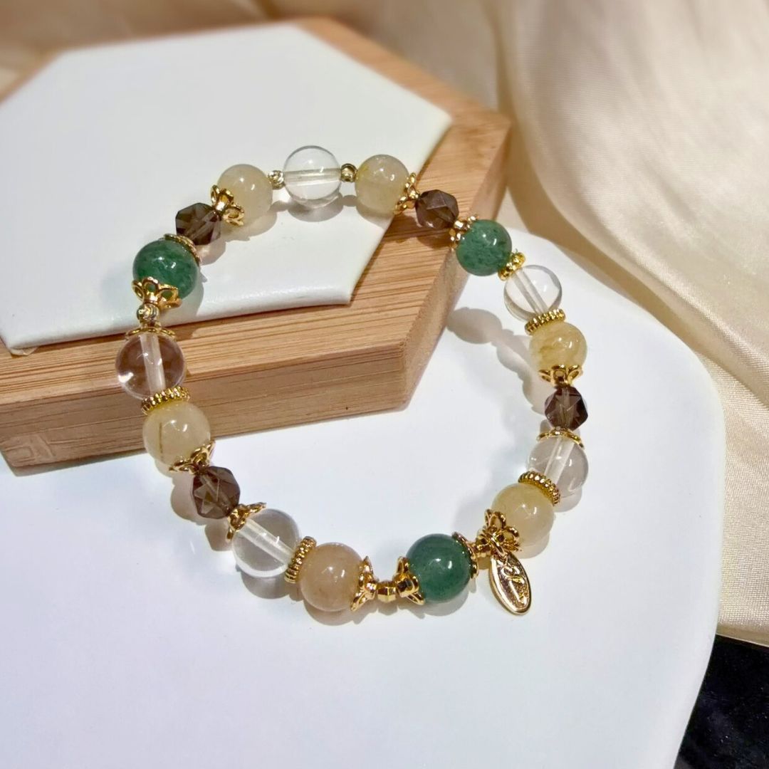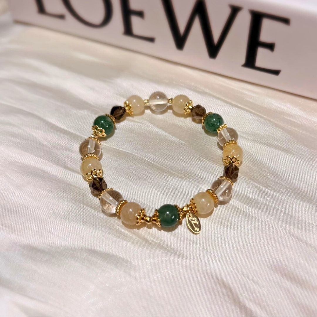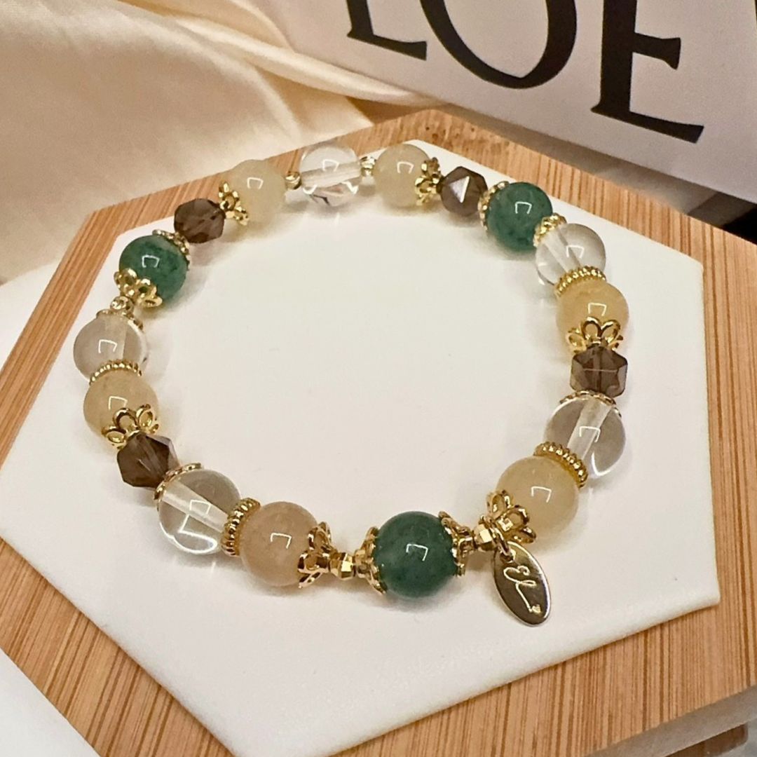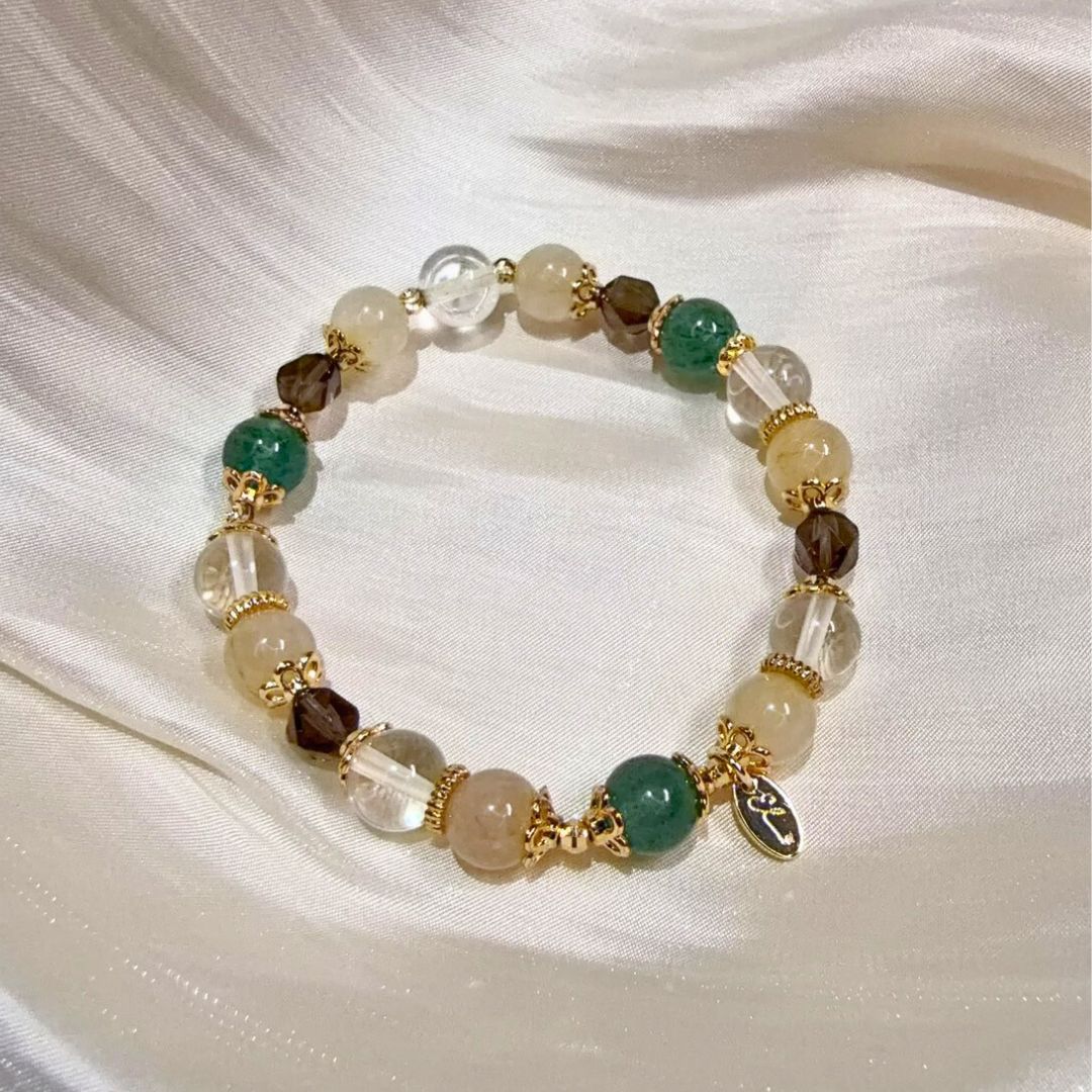 「綠野仙蹤」手鍊結合金髮晶、白水晶、綠草莓晶、茶晶,展現出優雅與富貴的氣質。金髮晶閃耀著細緻的金色光芒,能強化行動力與企圖心,幫助吸引財富與事業上的突破。白水晶瑙則以其溫潤純淨的能量,平衡情緒、淨化負能量,茶晶提升耐力與抗壓力,助力事業穩健發展。綠草莓晶有助於招桃花、帶來美好姻緣、改善人際互動,並能使人更加積極樂觀、提升學習與事業運勢。 綠草莓晶也被稱為「療癒之石」和「歡樂之石」。這款手鍊特別適合希望增強自信、提升職場表現佩戴,無論是日常穿搭還是重要場合,都能增添一抹優雅氛圍。