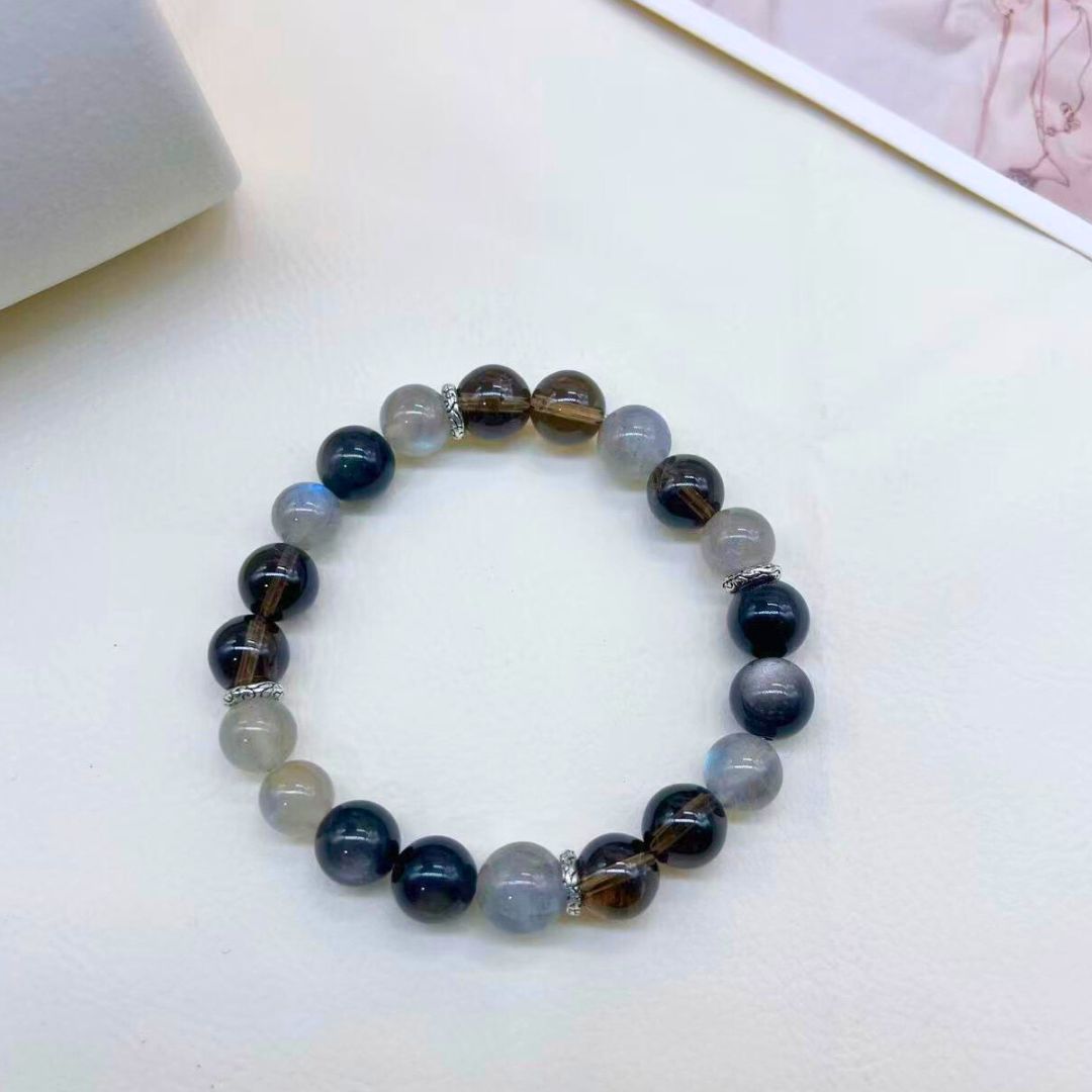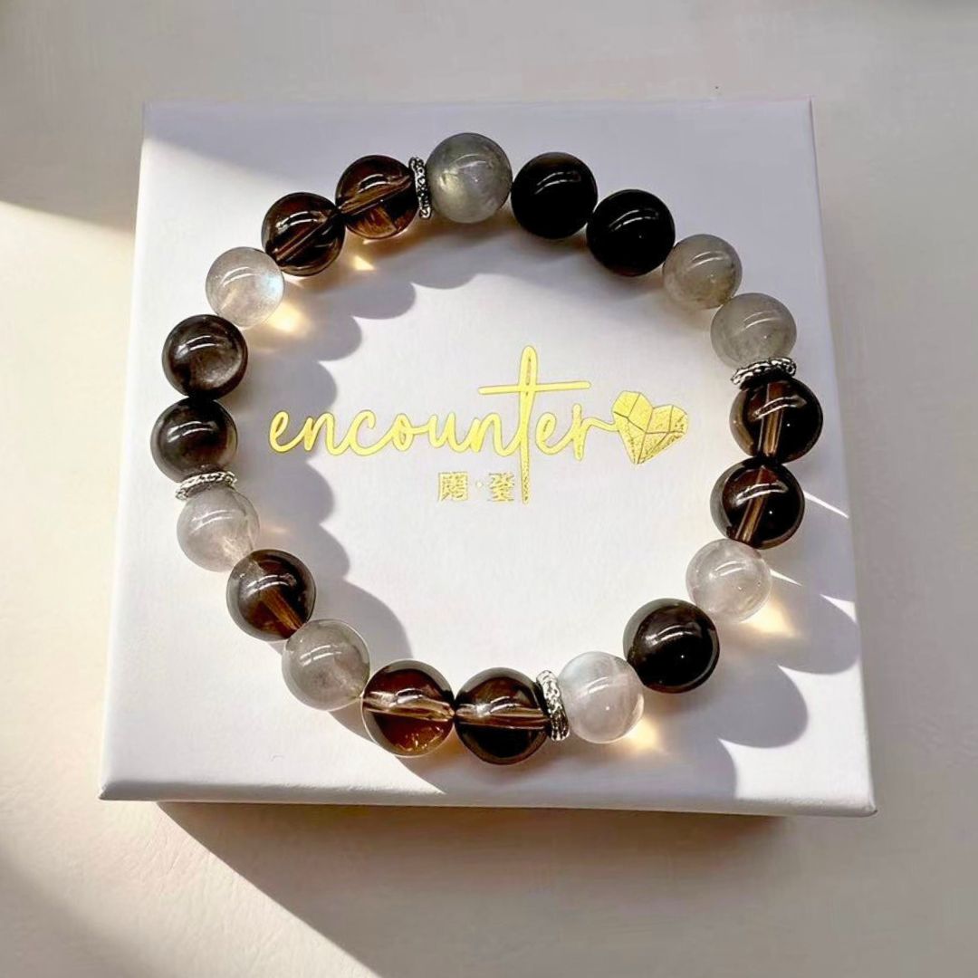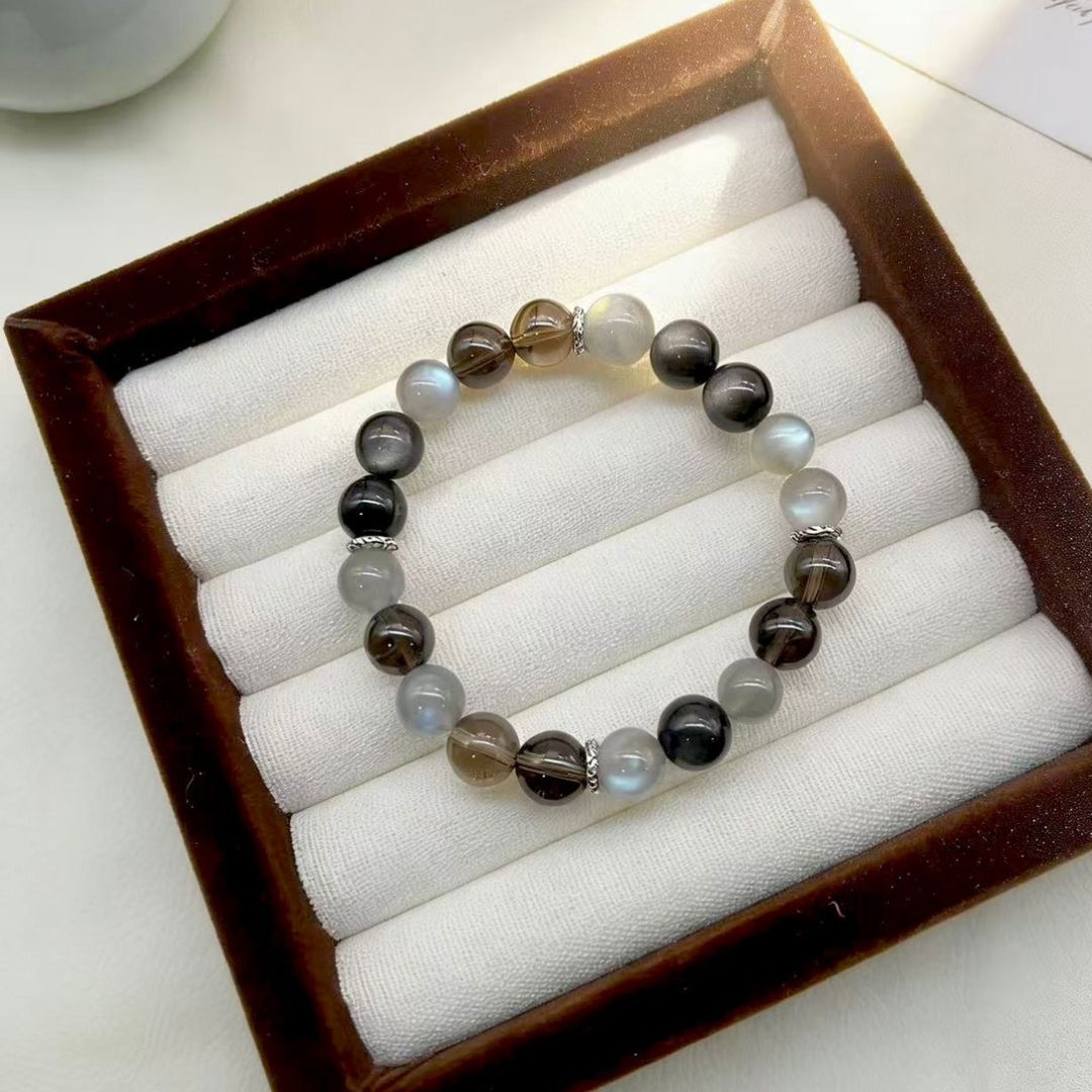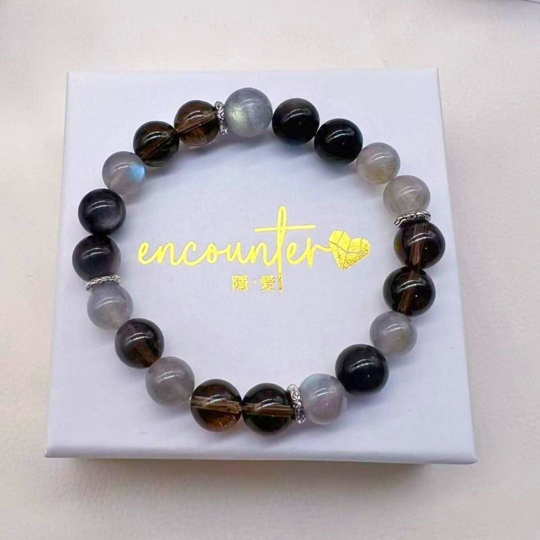 『白晝之眼』手鍊融合冰曜石 。銀曜石。灰月光石,呈現低調卻深邃的銀黑灰色光澤。冰曜石是黑曜石的一種,因其透明或半透明的質地而得名。 也可以稱作「冰種黑曜石」,具有很強的保護作用,可以抵禦負能量的侵襲,招財納福,提升財運。月光石增強直覺及人際關係,銀曜石能強化保護力,抵擋負面能量,