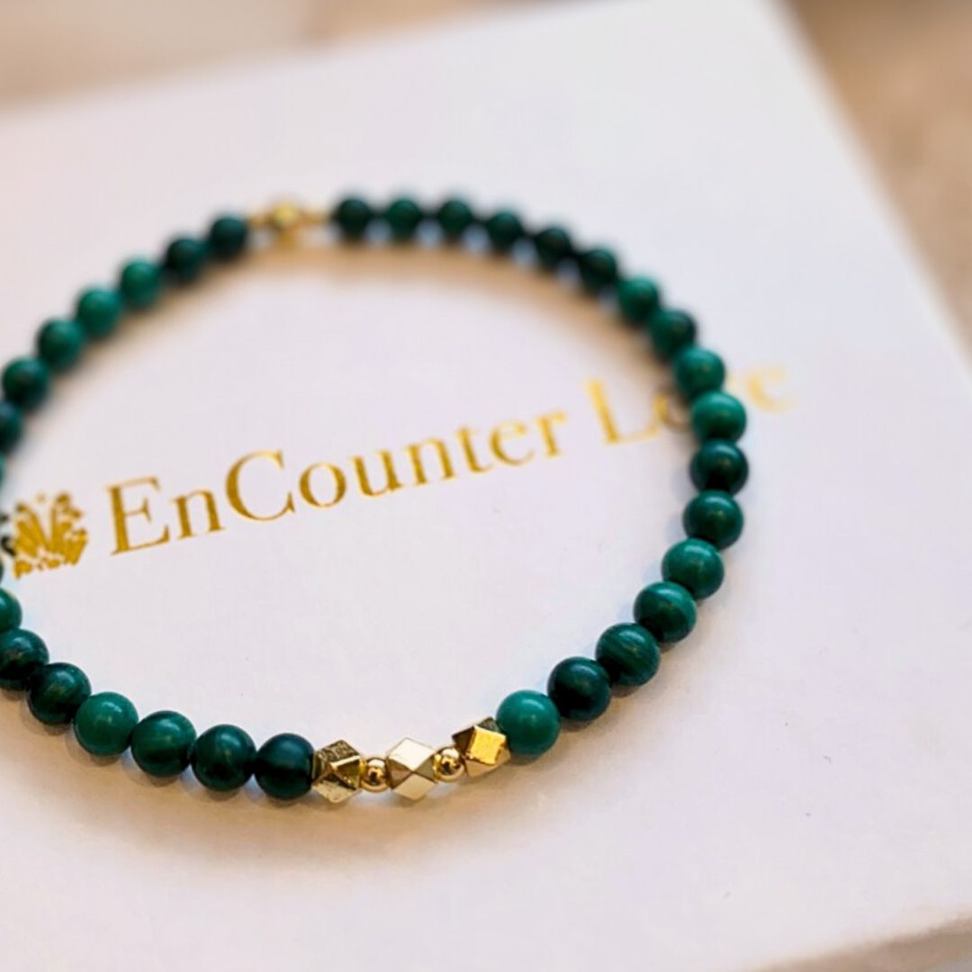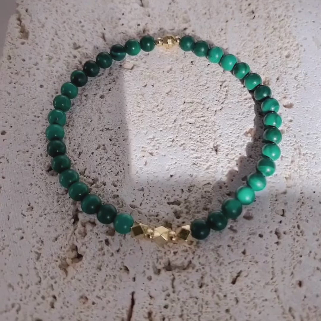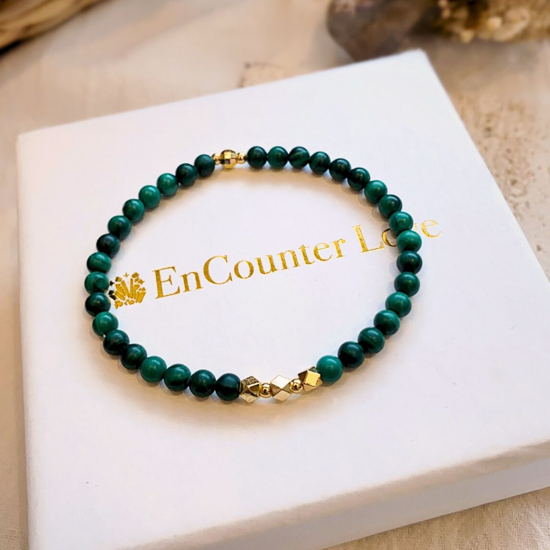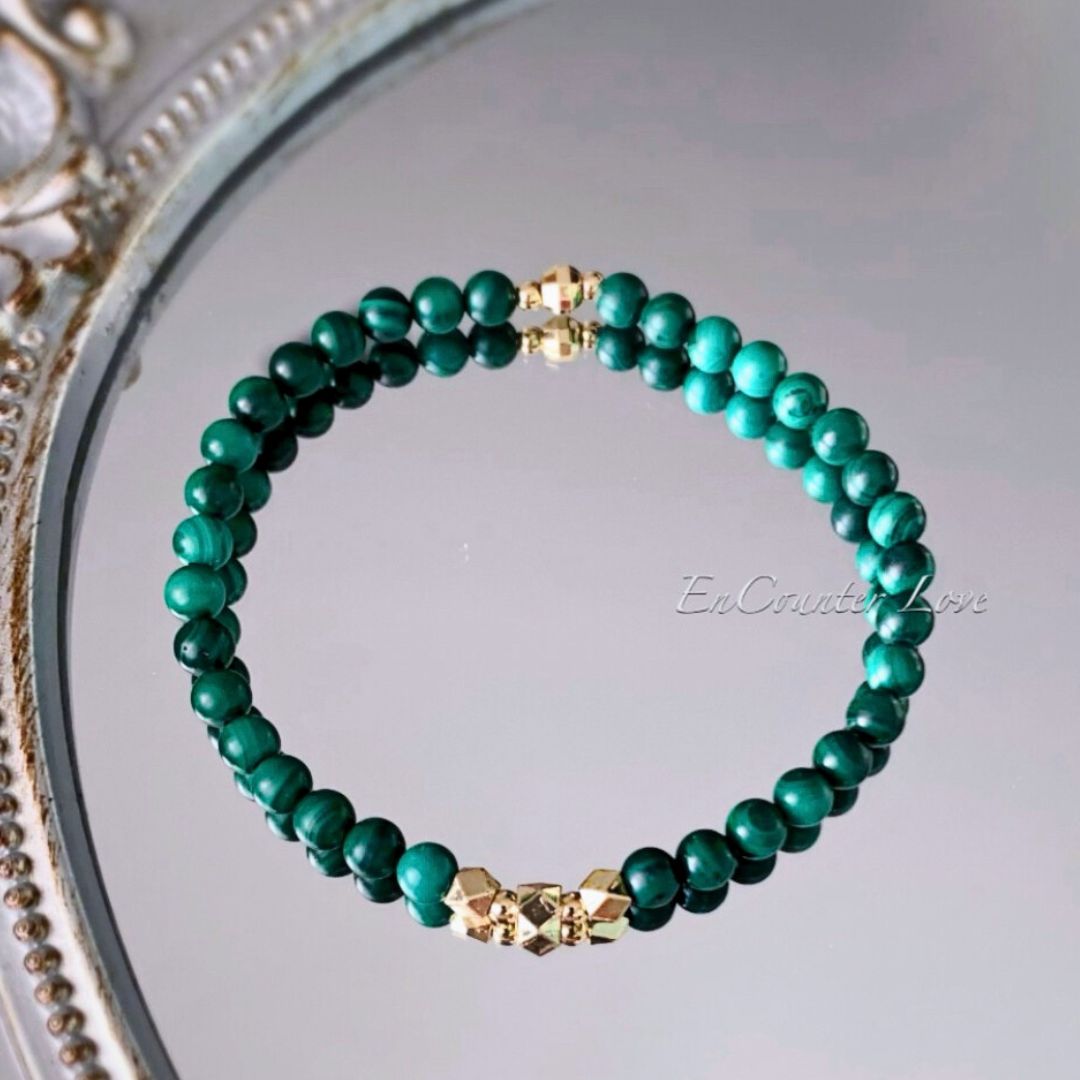 『莫綠』手鍊選用深綠色的孔雀石,獨特的紋理猶如大自然的藝術畫作。孔雀石以其強大的療癒能量聞名,能舒緩壓力,幫助修復心靈創傷,驅散負面情緒。這款手鍊非常適合需要穩定情緒、提升事業運勢的專業人士,特別是面臨高壓挑戰時佩戴,助您在職場上獲得更多貴人相助,事業更順利。