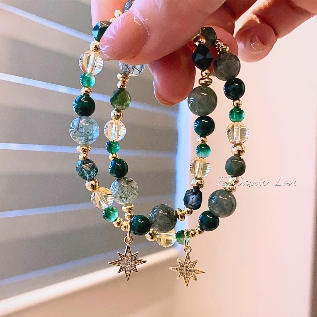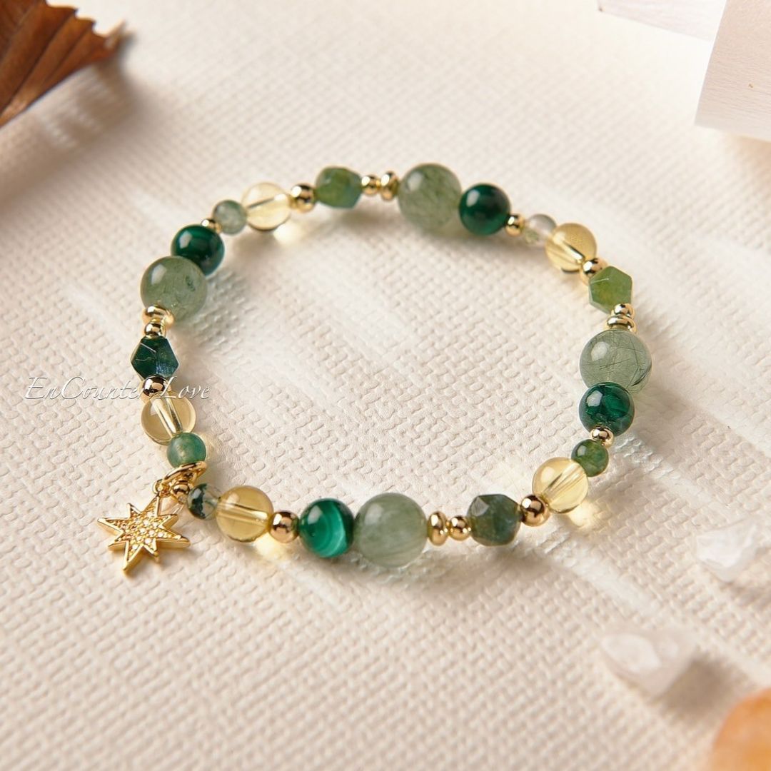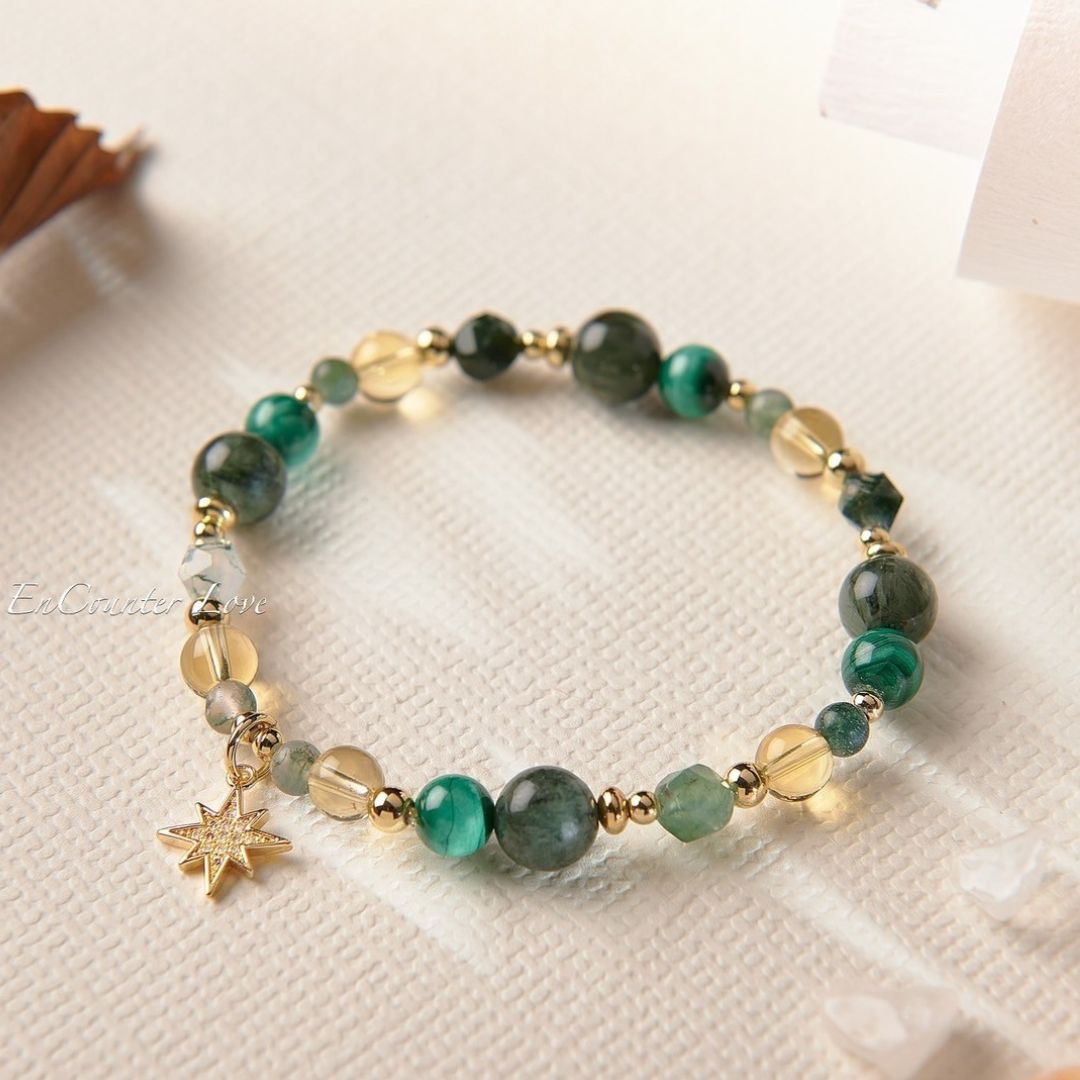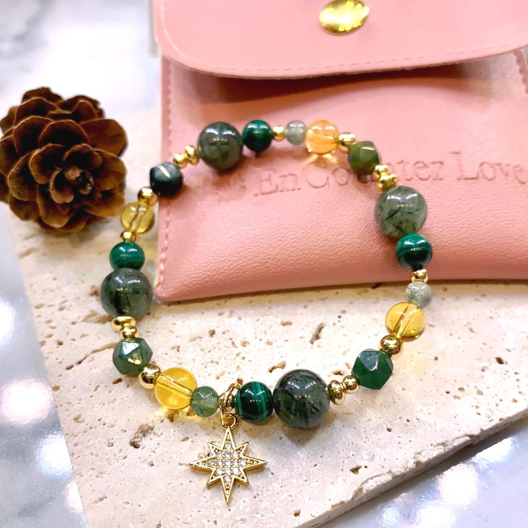 ❖ 水晶:綠髮晶(8mm)、黃水晶(6mm)、孔雀石(6mm)、黃瑪瑙(4mm)、綠瑪瑙(4mm)