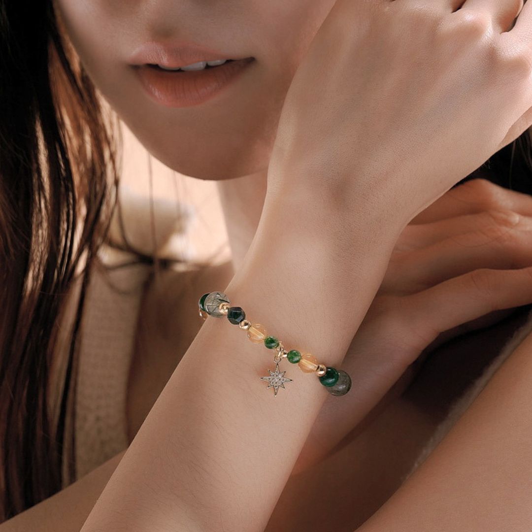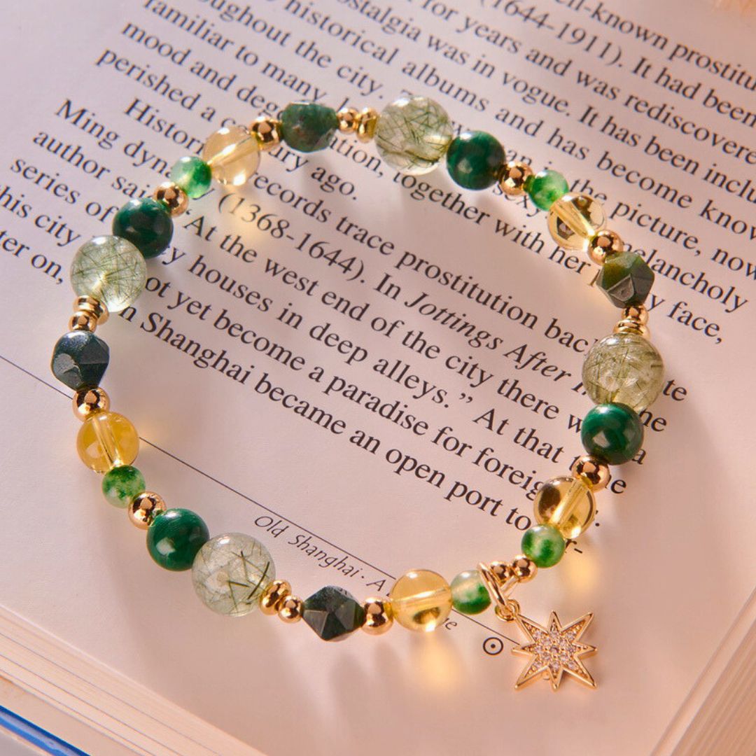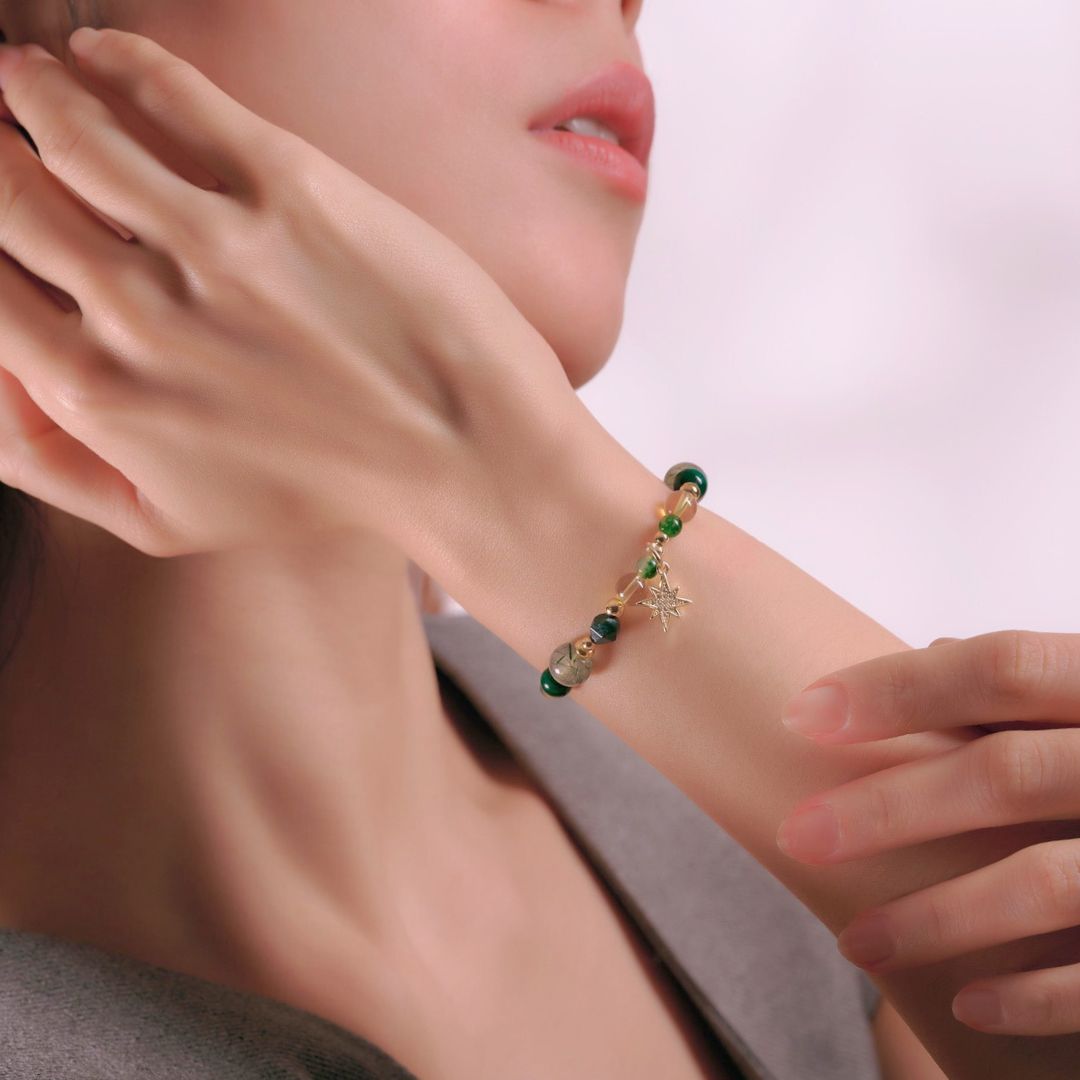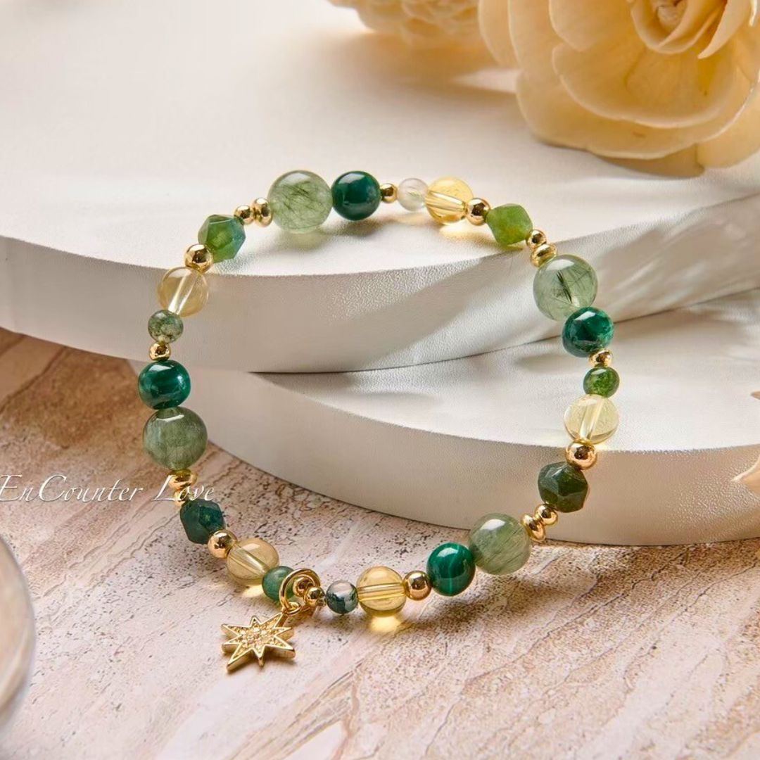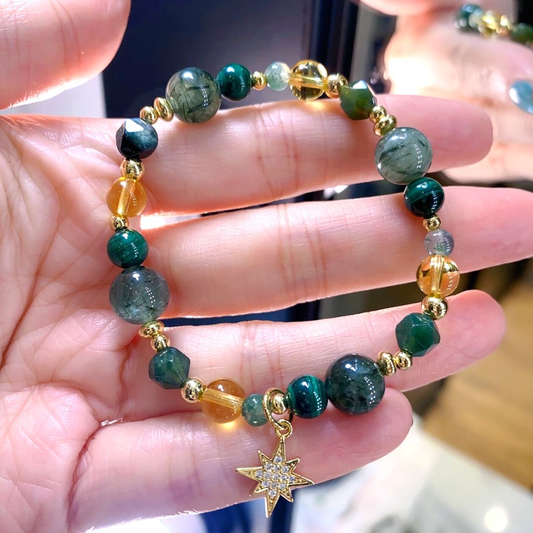 ❖ 水晶:綠髮晶(8mm)、黃水晶(6mm)、孔雀石(6mm)、黃瑪瑙(4mm)、綠瑪瑙(4mm)