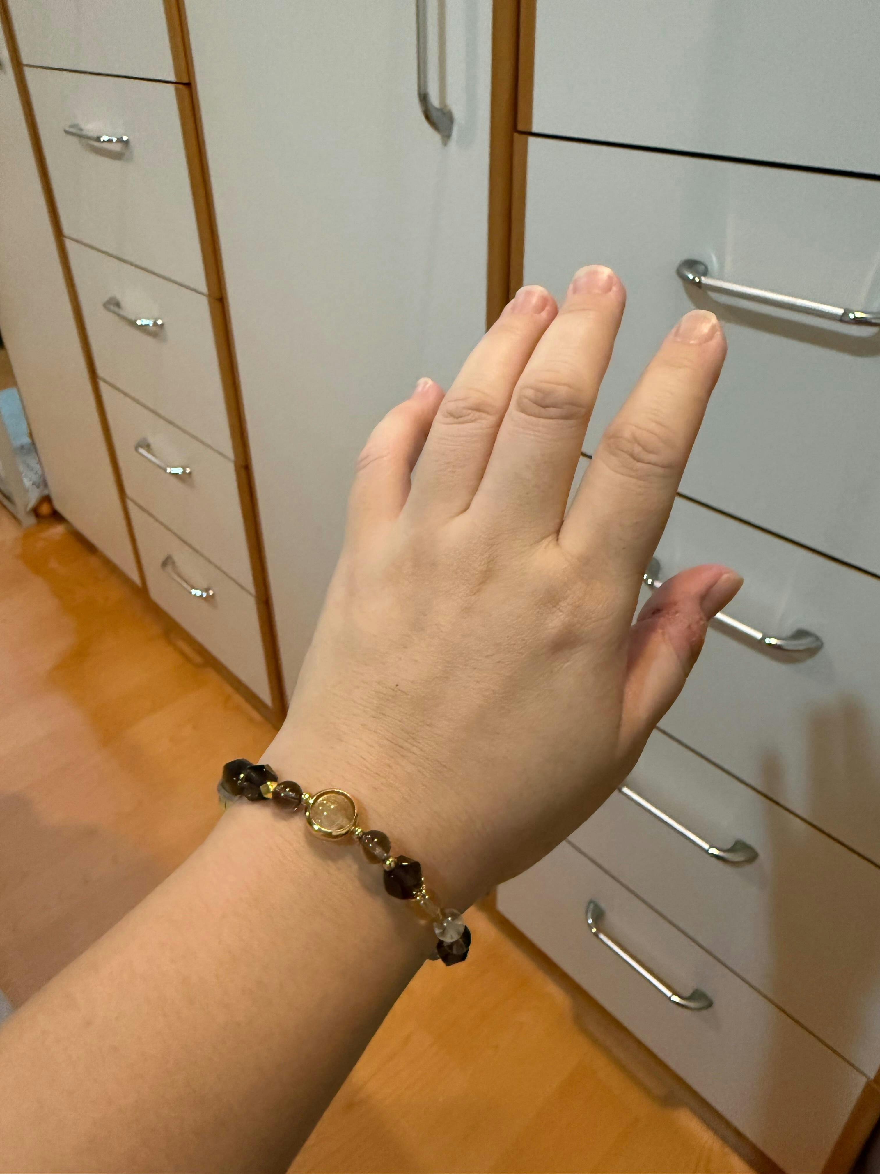 『虎之鏡』手鍊融合多種強大水晶,包括黃虎眼、金髮晶、茶晶、黑瑪瑙、月光石和黃水晶,為佩戴者提供全方位的保護與支持。黃虎眼增強勇氣與自信,金髮晶提升行動力與財運,茶晶穩定情緒,黑瑪瑙驅散負能量,月光石增強直覺,黃水晶則助於聚集財富。適合領導者、企業家以及需要在各方面取得平衡的人士佩戴,助您在挑戰中脫穎而出。
