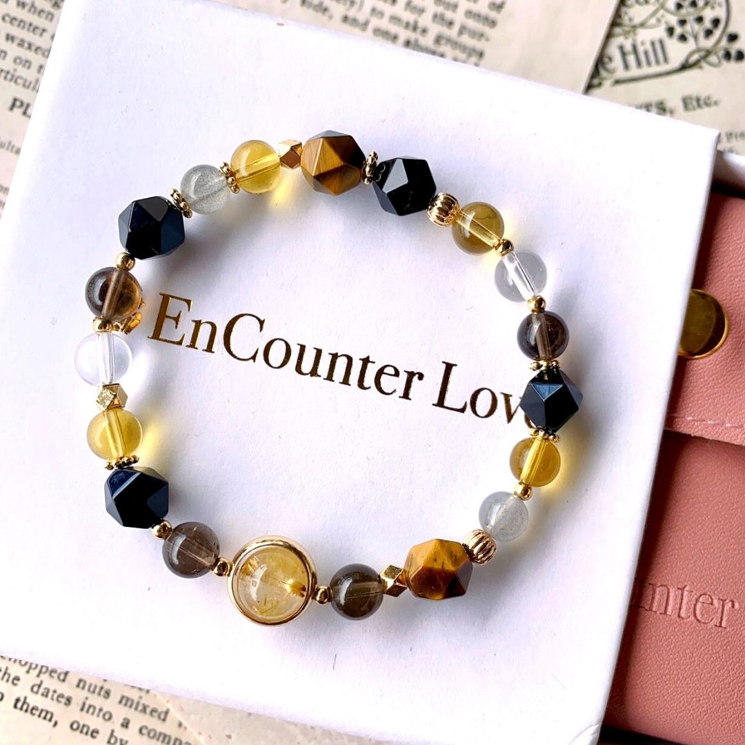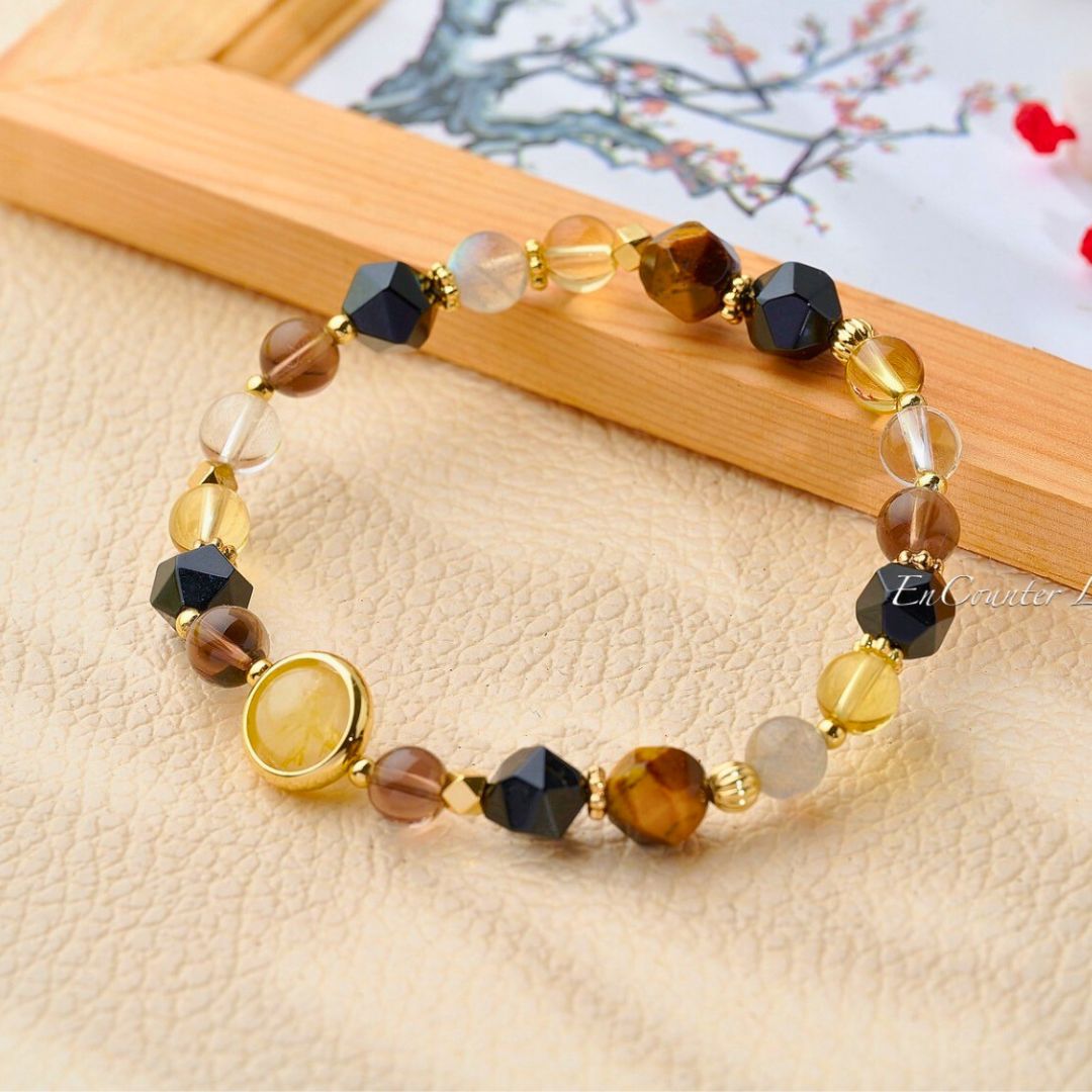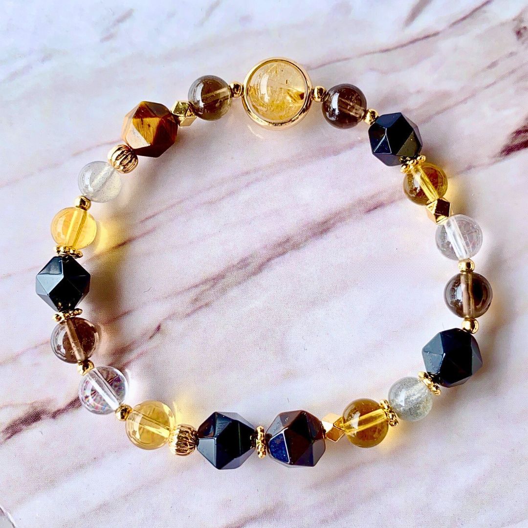 ❖ 使用礦石:金髮晶(約8mm)、黃虎眼(約7-8mm)、黑瑪瑙(約7-8mm)、黃水晶(約6mm)、白水晶(約6mm)、茶晶(約6mm)、灰月光石(約6mm)