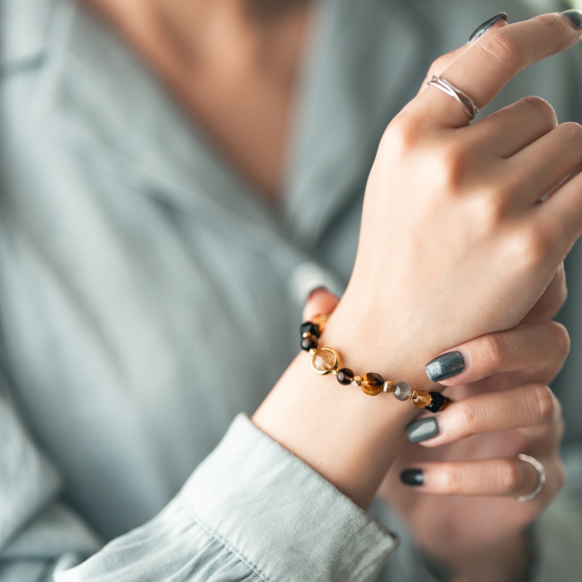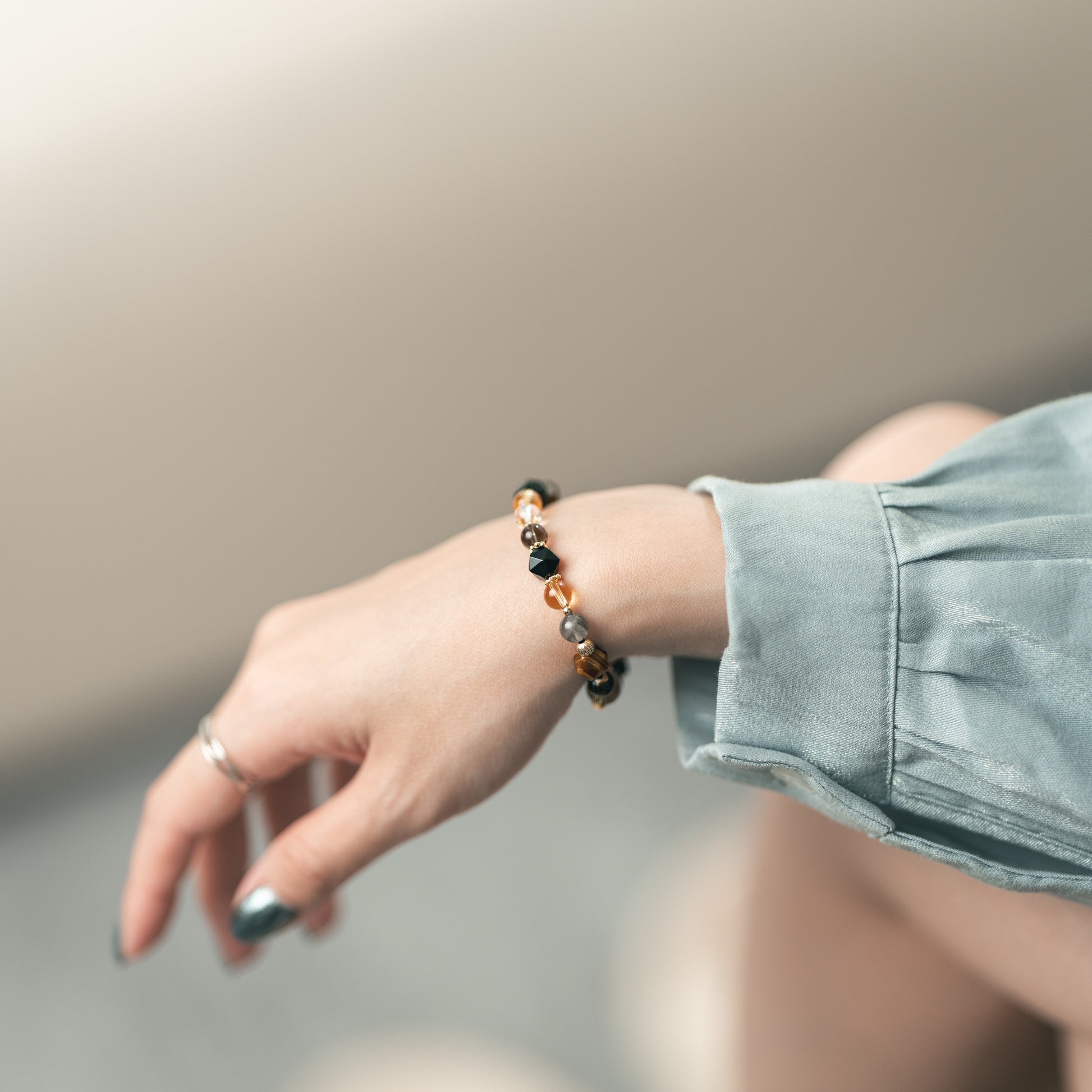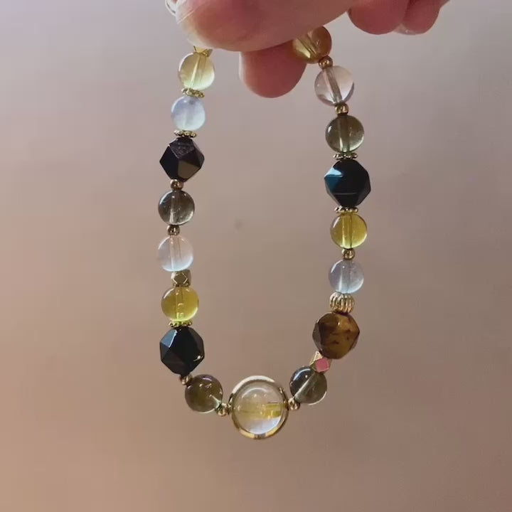 『虎之鏡』手鍊融合多種強大水晶,包括黃虎眼、金髮晶、茶晶、黑瑪瑙、月光石和黃水晶,為佩戴者提供全方位的保護與支持。黃虎眼增強勇氣與自信,金髮晶提升行動力與財運,茶晶穩定情緒,黑瑪瑙驅散負能量,月光石增強直覺,黃水晶則助於聚集財富。適合領導者、企業家以及需要在各方面取得平衡的人士佩戴,助您在挑戰中脫穎而出。
